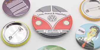 A kitűzők alakja és mérete állandó. A kitűző hátoldalán bitosítótű van, amellyel a jelvény a ruhára kitűzhető. Feliratozása 4 színcolorral történik. Méretek: kör: d=26mm, d=40mm, d=55mm.